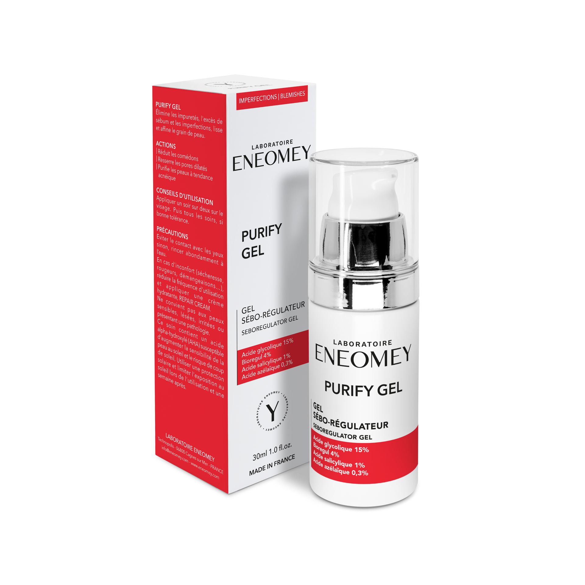 Purify Gel eliminates impurities, reduces sebum production and imperfections, smooths and refines skin texture.